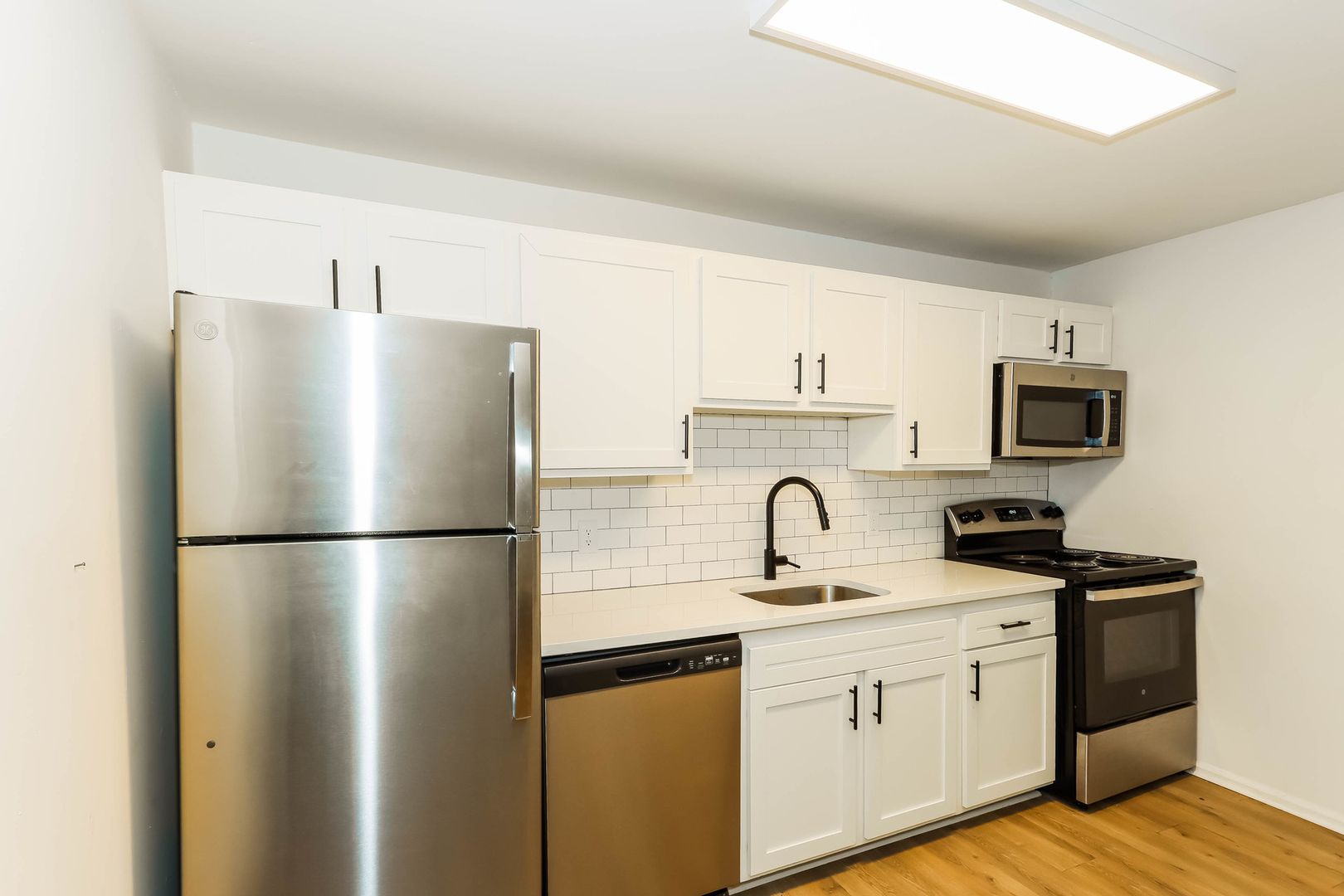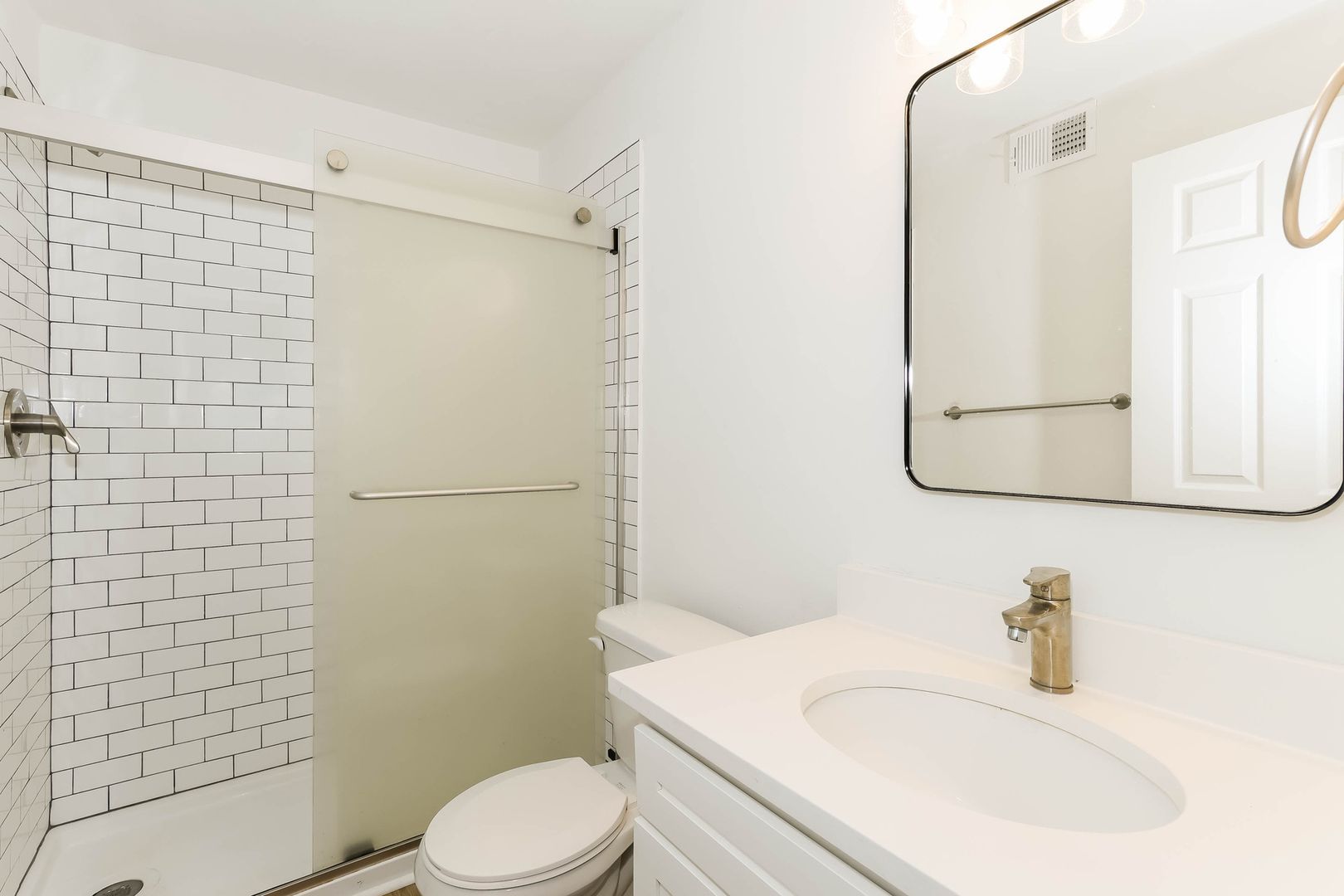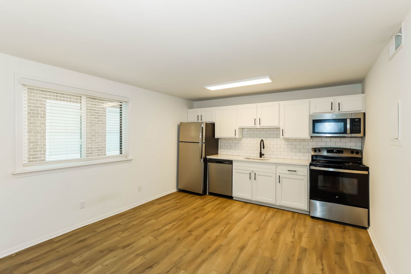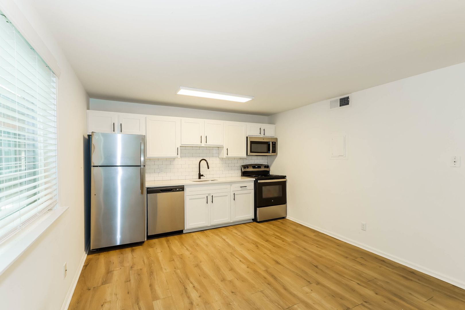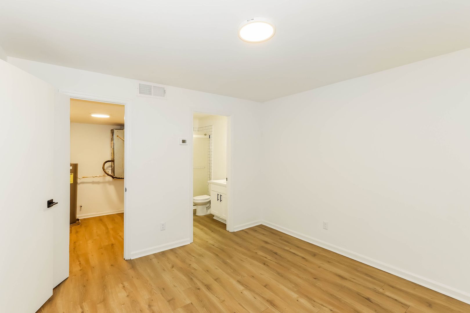 This 400 sq. ft. apartment maximizes space efficiency with a thoughtful layout. The kitchen features sleek white cabinetry, stainless steel appliances, and a subway tile backsplash, creating a modern cooking area. The 130 sq. ft. bedroom provides ample space for rest and storage. The bathroom boasts a contemporary design with a glass-enclosed shower and white tile walls. Throughout the unit, light-colored walls and wood-look flooring create a bright, airy atmosphere. Windows in multiple rooms allow natural light to flood the space, enhancing the open feel of this compact yet functional home. Buildings feature controlled access, onsite fitness center and 24-hr laundry facility.