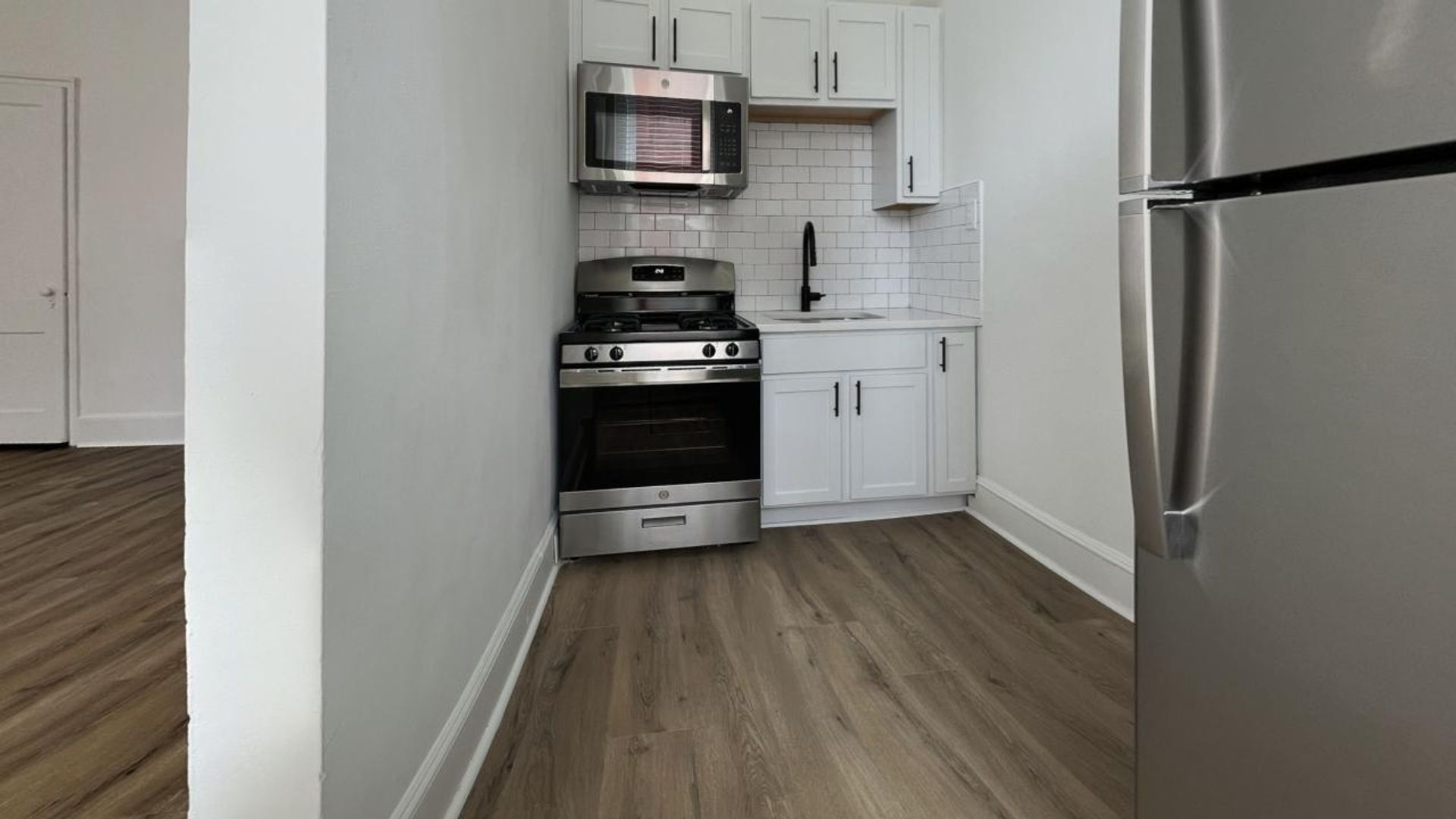 This 350 sq. ft. apartment in Charleston, SC, offers a blend of modern functionality and classic charm. The single-floor layout maximizes space efficiency, comprising a living room, kitchen, bathroom, and two closets. The kitchen showcases contemporary appeal with white cabinetry, subway tile backsplash, and stainless steel appliances including a microwave and range. The bathroom features a clean, timeless design with white subway tiles extending from floor to ceiling. Throughout the apartment, warm wood-look flooring adds a touch of elegance and continuity. The living areas benefit from natural light through windows equipped with blinds, creating a bright and airy atmosphere. An arched alcove adds architectural interest, while built-in storage solutions help maintain a clutter-free environment. The space is climate-controlled with a wall-mounted air conditioning unit, ensuring year-round comfort. Despite its compact size, this apartment offers a well-thought-out design that caters to modern urban living.