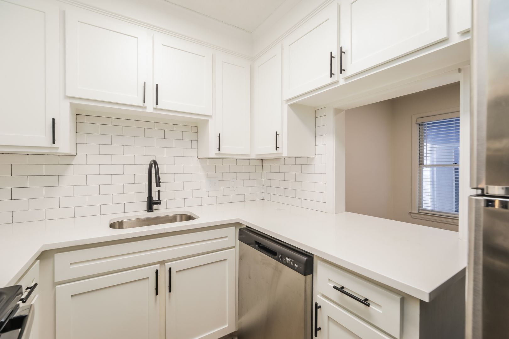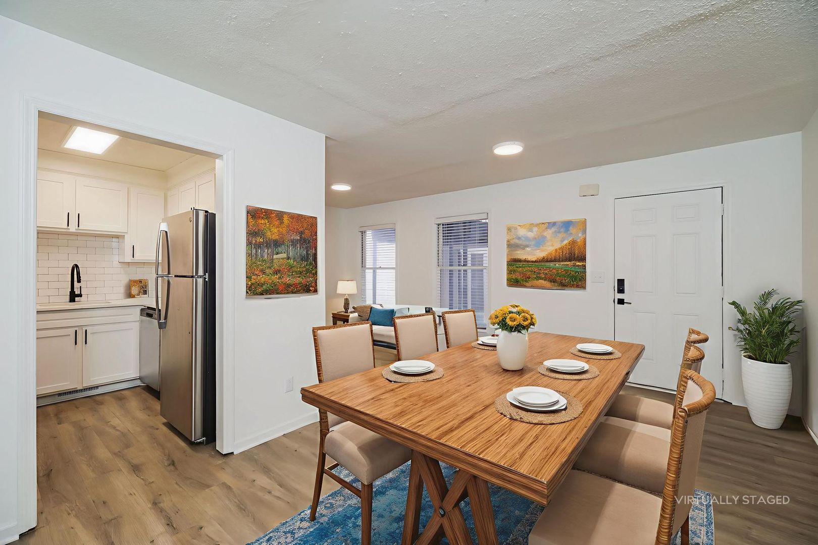 The kitchen is a chef's dream, with stainless steel appliances, a beautiful tile backsplash, granite countertops, and a convenient pass-through to the living room. The offset dining space can easily fit a 4-6 person table or be transformed into a cozy office or study area.